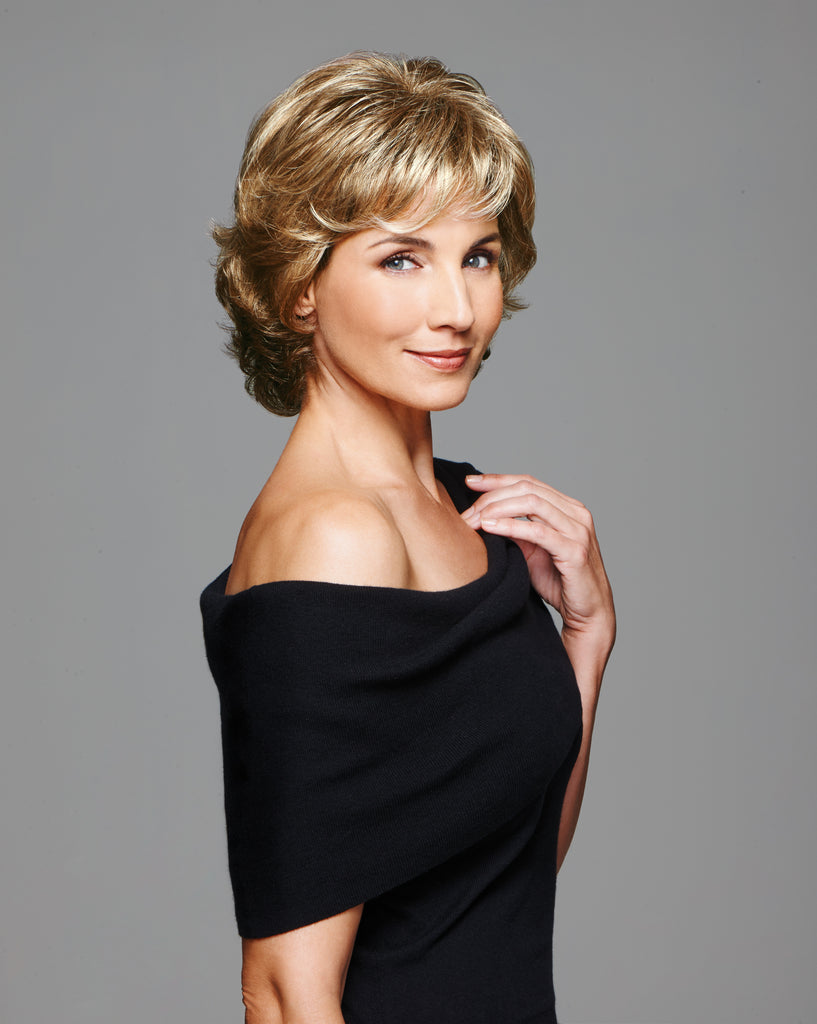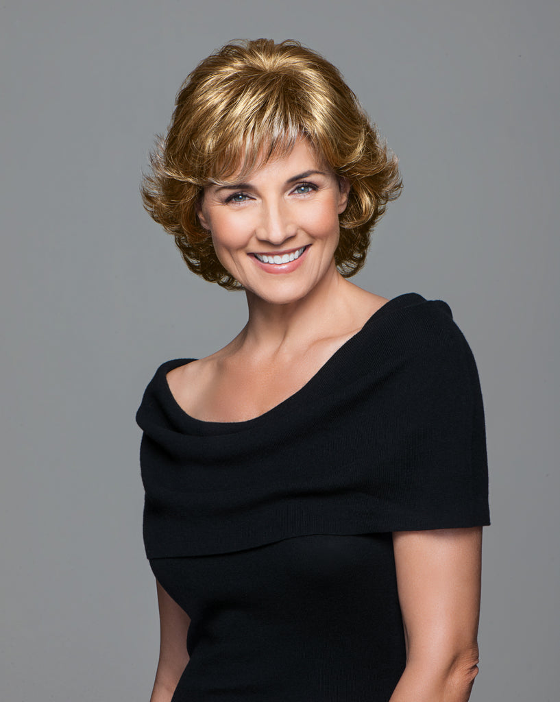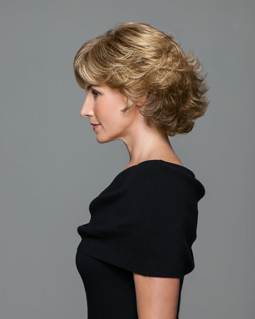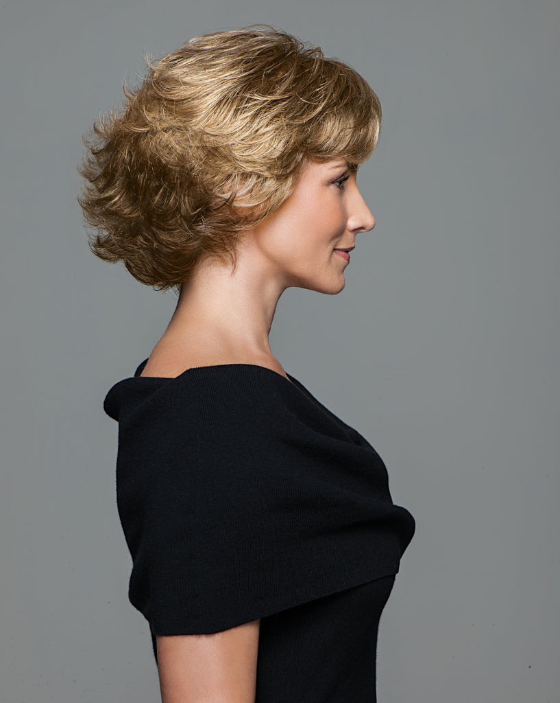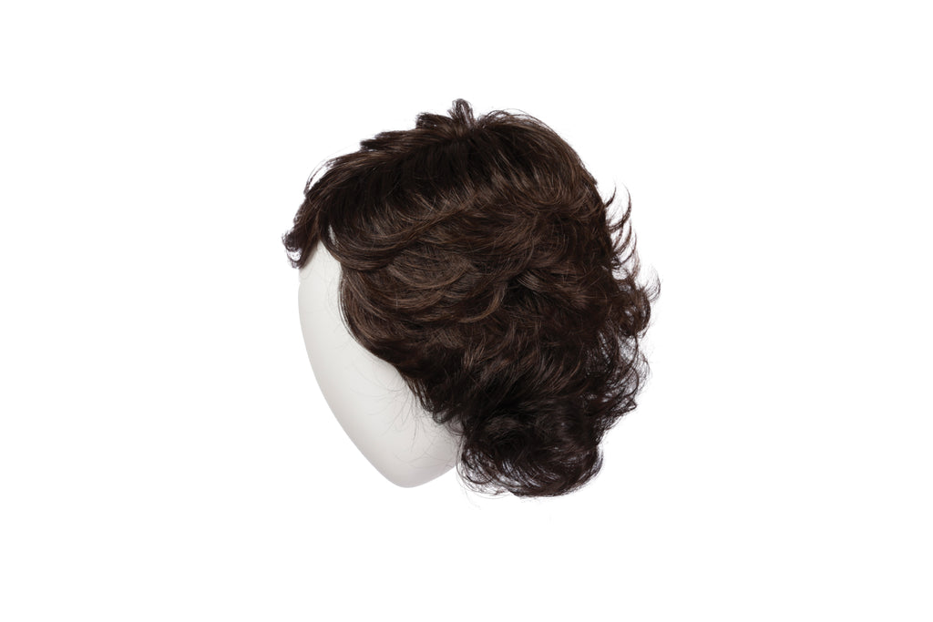 All-over curled layers are just right - not too short, not too long - with a light and luxurious hand-tied top.